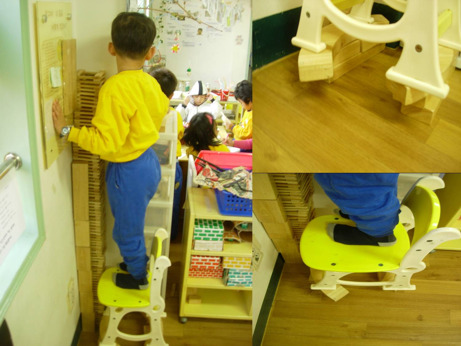 활동을 하던 유아는 의자에 오르내리기를 몇 차례 반복하더니, 옆에 있는 다른 유아에게 도움을 요청했습니다. 두 유아가 활동을 전개하다가 탑이 벽 쪽에서 기울어지자 예전처럼 자연스럽게 나무블럭으로 탑을 바로 세웠습니다.
