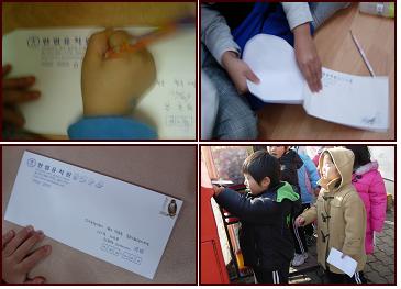 우표가 떨어지지 않도록 손으로 꾹꾹 눌러서 붙이는 아이들...