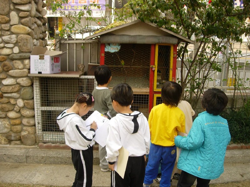 잉꼬 새장안에 새집을 다시 보기위해 잉꼬 새장을 찾은 유아들에게 무언가 발견되었습니다.