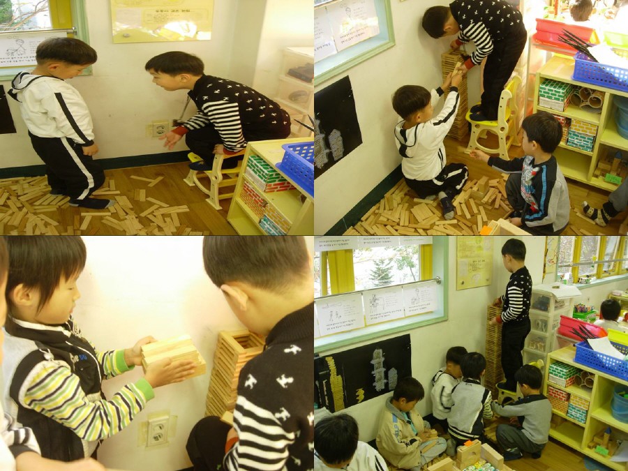 어느 정도 카프라 탑이 높아지자 유아는 쉽게 문제를 해결한다. 늘 그렇듯이 익숙하게 의자를 놓을 공간에 카프라를 치우고 의자를 가지고 와서 활동을 계속해 나갔다. 그런데, 이번에는 공동으로 활동이 이루어지고 있었다. 기존에는 한 유아가 의자 위를 오랐다가 내렸다가를 반복하면서 탑을 쌓았지만, 이번에는 아래에 있는 유아가 카프라를 주어주면, 의자 위의 유아가 쌓기를 하는 분업과 협동화된 활동을 전개해 나갔다. 유아들은 기존에 불편함을 서로 역할을 나누어 활동함으로써 문제를 쉽게 해결하며 활동을 계속 하였다.
