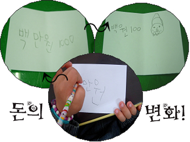 = 유아들은 하얀색종이를 이용하여 돈을 만들어 갑니다. 유아들이 만든 돈에는 숫자가 적혀 있는 것을 알지만 유아들이 적은 숫자와 글자는 맞지 않습니다. 그리고 인물이 그려져 있는 것도 알고 있지만 정확하게 알지는 못합니다. 그렇지만 유아들은 자신이 본 돈의 모습을 떠올리며 유아들이 만든 돈에 새로운 것을 하나씩 더해 갑니다.