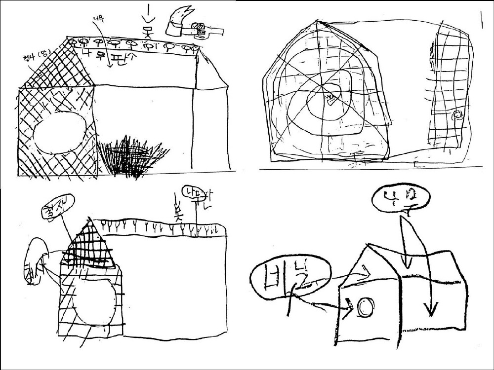 유아들은 대그룹공유 후 집 안이 보이는 집을 계획하고 그림으로 설계하였다.[거미 관찰이야기]