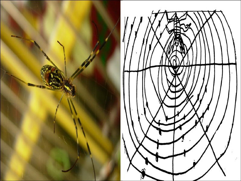 남수: 거미줄에는 잘 보이고 잘 보이지 않는 줄이 있어요. 잘 보이는 줄은 만져도 괜찮은데, 잘 안 보이는 줄은 끈적끈적하고 거미도 여기로는 잘못 걸을 것 같아요