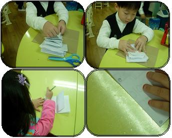 또 다른 유아들은 자신이 만든 책의 한쪽 한쪽 마다 페이지 수를 적어 보기도 하고, 자신이 만든 책을 여러권 연결하여 장수를 세어보기도 하면서 책마다 페이지 수가 있다는 것에 관심을 가지고 있다.