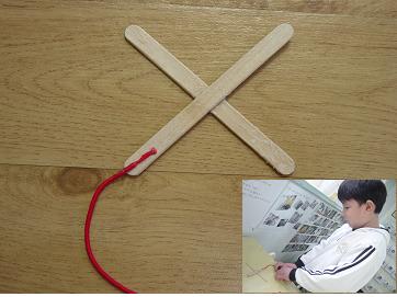 영역활동시간 한 유아가 아이스크림 막대 두 개를 붙여 부메랑을 만들었다.