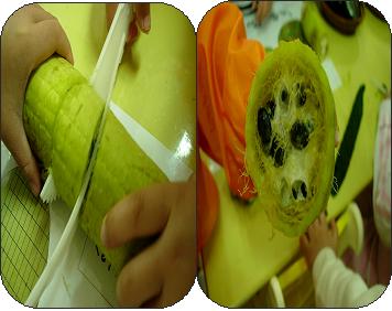 유아들은 또 다시 수세미를 자르기 시작합니다.