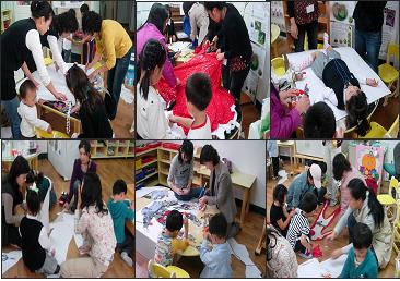 어느 것에 흥미를 가지는지...새싹반에서 일어나고 있는 디자인 영역에서는 어머니와 함께 테마가 있는 옷을 만들어 보기로 합니다. 한 유아가 포즈를 취하여 종이에 누워 본을 뜨고, 그 위에 멋진 옷을 만들어 갑니다.나 혼자만이 아닌 여러 사람과 토의를 하여 의견을 모으고 하나의 멋진 공동작품을 만듭니다.