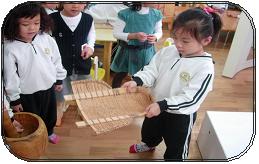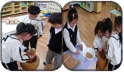 (절구와 키의 사용법을 가르쳐 주고 볍씨를 절구에 넣어 직접 찧어본다. 놀이 시간을 이용하여 절구를 사용한 후 직접 쌀과 겨를 구분해 내는 잎새반 유아들...마냥 신기해하는 모습들로 가득했다.)