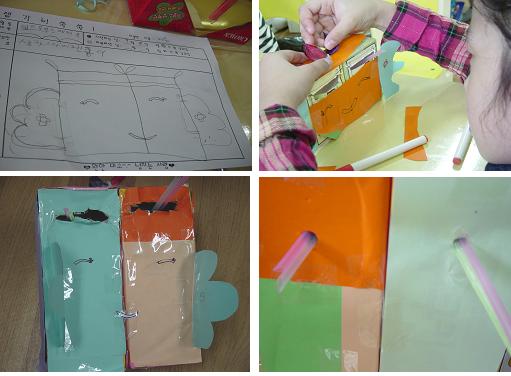영역활동 시간, 조형영역에서는 두 명의 유아가 똑같은 그림을 그려 설계를 하고 만들기를 하고 있다. 무얼 하는 걸까? 가만히 들여다보니 종이 상자에 구멍을 내어 빨대를 꽂아 직접 입으로 불어 사용하는 에어컨을 만들고 있었다.