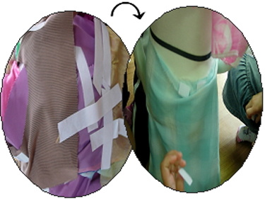 = 손으로 만지면 촉감이 틀린 두 매체. 매체를 사용하면서 서로 붙는 방법과 떨어지게 하는 방법을 알아가며 유아들이 만든 옷에 테잎이 붙어서 못난 것이 아니라 예쁜 천의 색깔이 더 많이 보이게 됩니다.