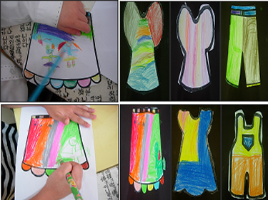 <옷 디자인 하기>유아들이 천을 마네킹에 두르며 여러 가지 옷을 만들어 갑니다. 그렇지만 커다란 천들은 옷을 만들기에 너무도 힘이 듭니다. 생각대로 잘 되지도 않습니다. 그래서 유아들에게 여러 가지 옷 모양의 본과 색연필을 제공합니다.