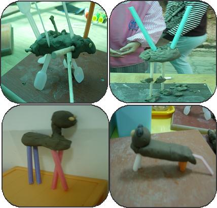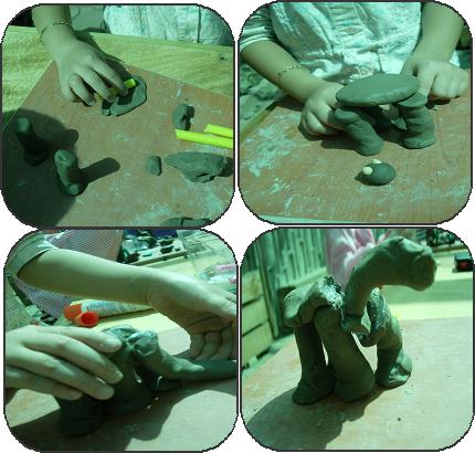 공룡의 다리를 일정한 높이와 굵이를 생각하여 만든다. 공룡 몸통을 만들어 다리 위에 올린다.