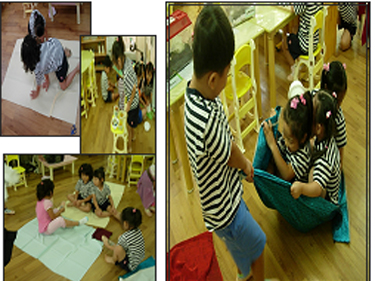 =큰 것은 무엇이든 썰매를 탈 수 있다는 유아의 말에 몇 가지 종류의 큰 종이를 제공합니다. 신문, 종이 등 다른매체를 이용하여 썰매를 탔을 때 찢어지자 관심은 다시 천 썰매로 모입니다. 유아들은 천에 올라가 타는 것에 흥미를 느끼고 너무나 즐거워 합니다.