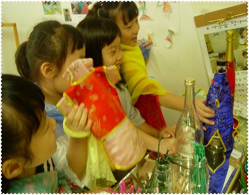 유아3: 이 옷 예쁘다. 병에 입히니깐 진짜 사람 같다. 내가 디자인해서 입힐까?