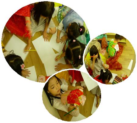 - 디자인영역에서 자신들이 디자인한 옷(천을 걸치고)을 입고 놀이를 하는 아이들이 병에 입혀져 있는 중국 전통의상을 보며 이야기를 한다.