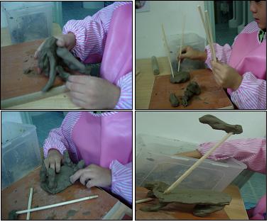 공룡의 다리 부분을 만들고 위에 몸통을 올렸더니 무너져 버리는 찰흙. 오랫동안 찰흙과 씨름을 하다가 도움을 청한다.