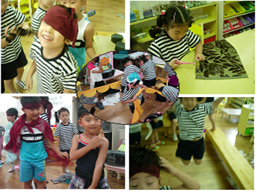 천을 이용하여 노는 유아들의 모습은 거의 비슷하지만 속속들이 들여다 보면 이루어 지는 놀이들은 조금씩 다릅니다. 이렇게 놀이에서도 자신이 지원하는 것과 평소 접해 본 것들이 나타나 있습니다.