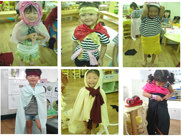 그 모습을 본 다른 유아들도 한 명씩 천을 꺼내어 머리와 몸에 두르기 시작합니다. 시간이 지날수록 천을 가지고 노는 유아들이 많아지고 여러 가지 놀이를 합니다.