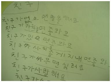 그래서 아이들은 메세지센터의 친구사진을 보거나 친구의 얼굴을 보며 친구얼굴을 그려 보았다.친구의 얼굴을 그리고 친구를 생각하며 적은 글들이 아이들의 친구라는 존재는 자신과 함께 하고