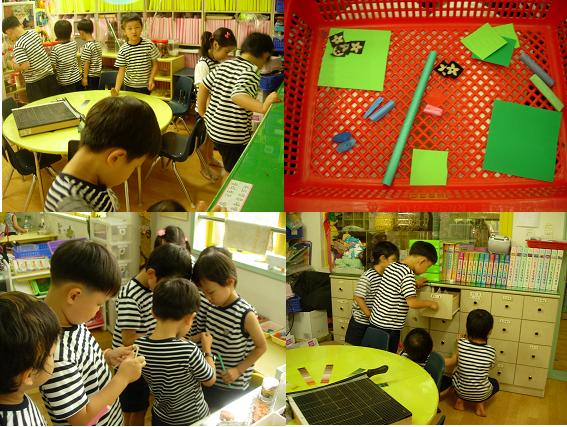 바람개비의 날개로 빨대가 적절하지 못하다고 생각한 유아들이 새로운 재료를 찾아 교실과 아뜰리에를 다니며 신중하게 재료를 고르고 있다.