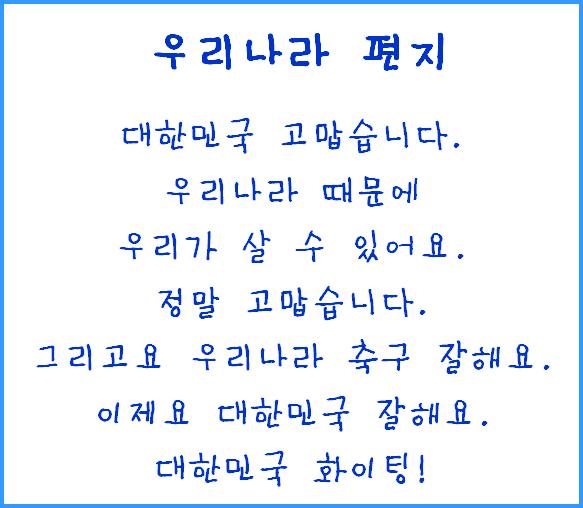 아이들이 적은 글들을 몇 가지만 올리는 것이 아쉽기도 하지만 월드컵과 맞물려 아이들이 나라를 사랑하는 마음을 알 수 있는 좋은 기회였던 것 같다.3팀으로 나누어져 어떤 그림을 그릴지 의논하고 예상 그림을 그려 본 후 그림 그리기에 들어갔다.