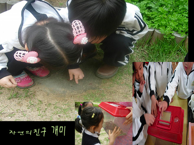 유아들은 내가 무엇인가를 생각하여 만들기를 하는 것도 좋아하지만, 밖에 나가서 자연의 보물들을 보며 뛰어노는 것도 좋아한다. 바깥놀이를 하는 중 유아가 개미를 손으로 잡아서 왔다.“선생님~ 개미예요. 왕개미” 한 명의 유아가 개미를 잡자 몇 명의 아이들도 개미에 관심을 가지기 시작했다. “선생님. 교실에서 키웠으면 좋겠어요.”라는 말에 새싹반 유아들은 너나 할 것 없이 개미를 기르고 싶다고 말을 했다.
