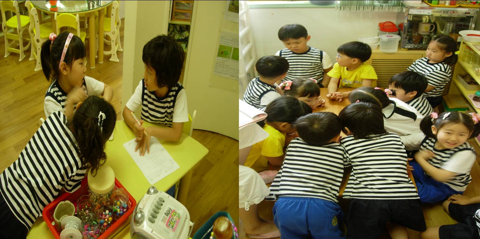 유아들은 팀별로 모여 활동을 계획하기 시작했습니다. 팀별로 1명의 친구가 친구의 이야기를 기록했고 다른 유아들은 자기 생각을 발표했습니다.