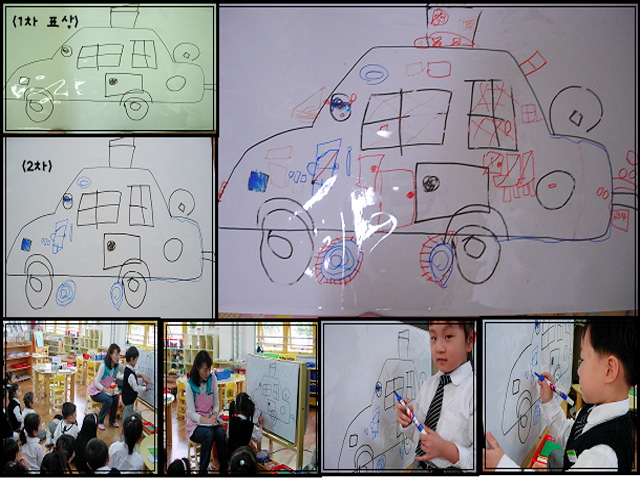 친구들의 생각을 한 곳에 모아보았다. 자동차의 틀을 하나 하나 채워나갔다. 그리고 새싹반 친구들과 그림을 보고 이야기를 나누었다.