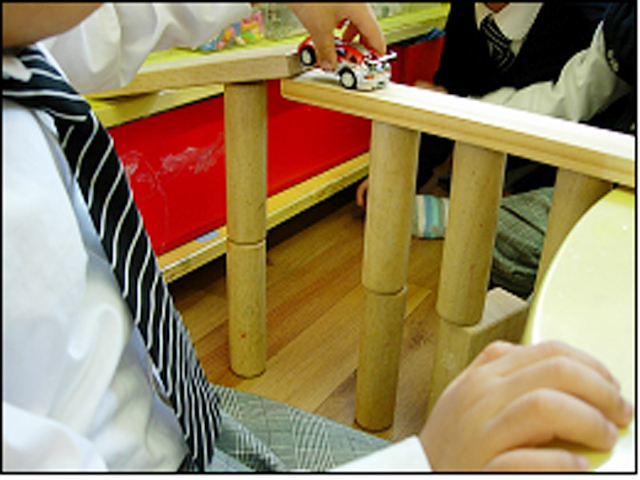 유아들은 두 개의 블록을 서로 교차 시켜 올려놓는다. 그리고 자동차를 이동시킨다.