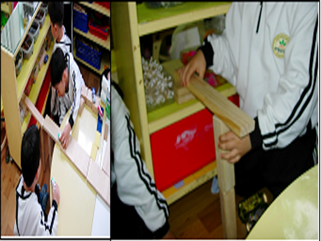 -긴 나무블록 하나를 가지고는 쌓기 단상 옆으로 연결시킬 수 없다. 그렇지만 단상의 높이와 비슷한 높이의 막대를 받쳐서 혼자서는 설 수 없는 판을 바로 세웠다.