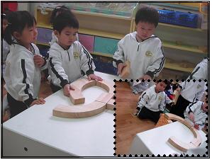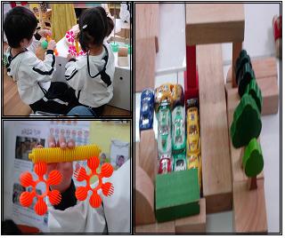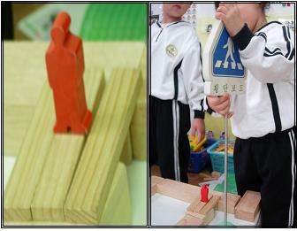 그때 또 다른 유아가 어디서 종이블록을 하나 가져와 받쳐 준 후 위험표지판을 세웠다.