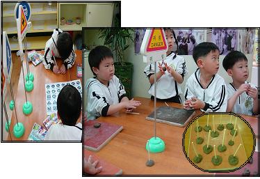 그렇게 한 명씩 나와 자신의 생각을 이야기 하고 드디어 의견이 모아져 유아들이 다같이 표지판을 만들기 시작했다. 먼저 기둥은 나무젓가락을 이용하고 나무젓가락을 세우기 위해 찰흙 받침대를 만든 후 표지판을 그렸다. 유아들이 만든표지판....