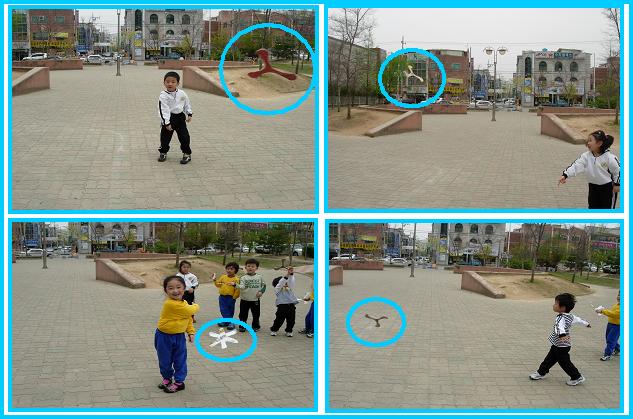 아이들.. 비가 오지 않자 아침부터 부메랑은 언제 날리냐며 물어보았다. 그래서 아이들과 야외로 나가서 지켜야 할 규칙에 대해 이야기 한 후 유치원 옆 공원으로 나갔다. 부메랑을 만든 아이들은 자신의 부메랑을 날리고 그 외 아이들은 판매용 부메랑을 날려보도록 약속을 정했다. 다른 친구들이 지켜보는 가운데 종이부메랑을 만든 유아들이 자신의 부메랑을 던졌다. 부메랑을 날리기 시작하자 지켜보는 아이들은 부메랑 날리기 시합도 아닌데목청 높여 응원하는 것이였다.