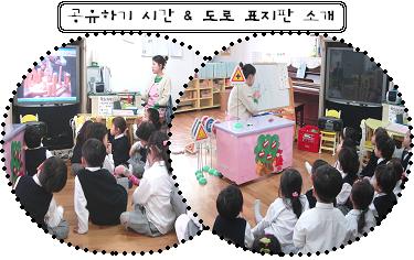 자동차도로 표지판의 의미를 잘 모르고 있는 잎새반 유아들에게 자동차 도로의 표지판의 그림과 뜻이 설명되어 있는 사진을 벽에 전사 해 주었다.