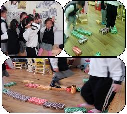 시범을 보인 뒤 앉아서 순서를 기다리고 있던 유아들이 그 방법과 규칙에 따라 징검다리를 건너고 그 중 또 다른 유아가 블록을 가지고 또 다른 게임을 만든다. 그리고 다시 정한 게임의 방법