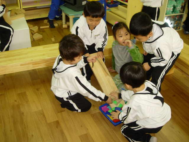 정리하는 방법도 다양한 아이들에게 정리도 놀이입니다. 한 아이의 제안으로 시작된 새로운 정리방법. 도미를 나무의자 위에서 가지고 놀던 아이가 나무블록으로 미끄럼을 만들고 도미노 바구니를 받침대로 받칩니다. 그리고는 도미노를 미끄럼으로 내려보내 골인!