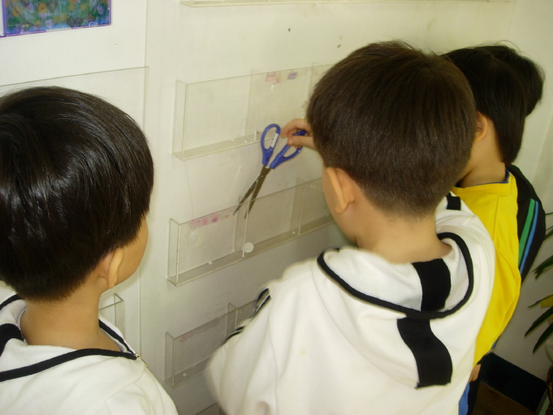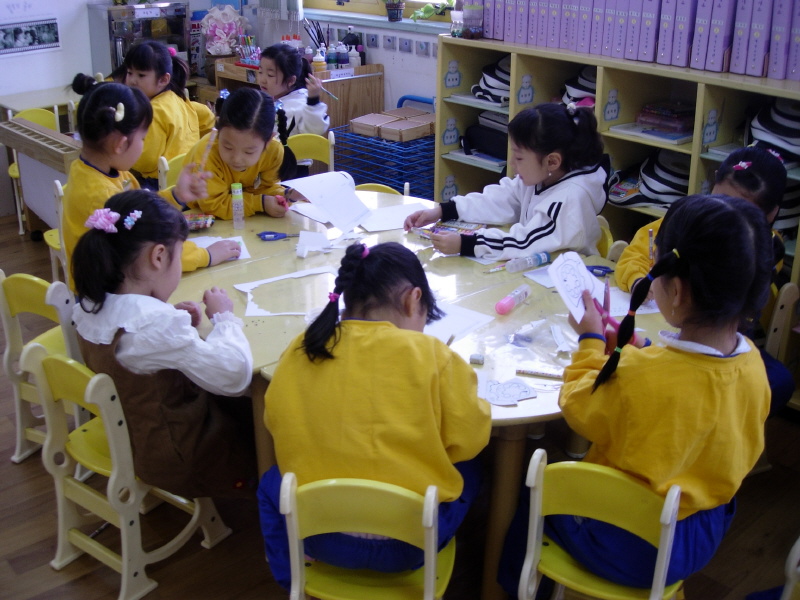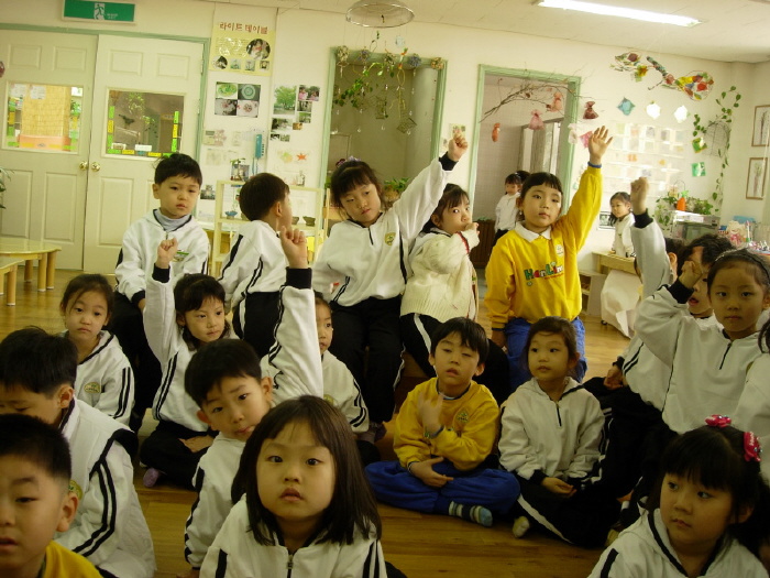 아이들은 함께 놀며 생각하고 일상과 주위에서 멋진 아이디어를 얻고 가꾼답니다.놀이가 끝난 후 아이들이 모두 모였습니다. 누군가" 저기 조형영역이 엉망이예요. 친구들이 정리 안하고 왔는가봐요." 그러자 다른아이가 " 내가 정리 할려고 했는데 너무 어지럽혀져 있어서 그냥 왔어요. 난 조금밖에 안했는데..." 이렇게 시작된 정리에 관한 아이들의 여러가지 생각들..." 내 생각엔 키가 큰 친구들이 힘이 세니깐 키 큰 친구들이 정리를 하는게 좋을 것 같아요." " 야~ 그럼 우리만 힘들잖아." " 아니다. 남자가 힘세니깐 남자친구들이 다하는건 어때요? " "야! 여자도 힘세다." " 난 정리시합을 하는게 좋겠어요." " 시합하면 싸울 수도 있잖아요. 차라리 가위바위보를 해서 이기는 친구가 정리해요." "그럼 그친구만 힘드니깐. 그냥 교실을 세 군데로 나누어서 열명씩 팀으로 정리해요." 많은 의견이 이야기 된 후 아이들과 다수결로 결정을 했답니다. 과연 어떤 방법일까요? 하늘반 아이들 모두 스스로 정리 할 수 있을지...
