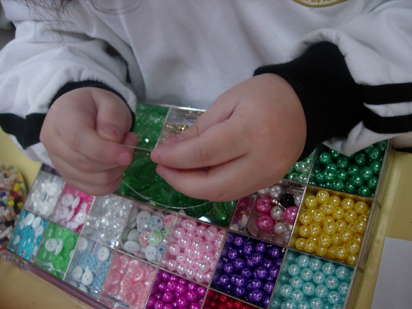 정미: 제가 구슬영역에 구슬을 꿰로 갔는데 거기에 묶여있는 낚시줄이 있었어요. 그래서 묶여있는 위에 필요 없는 부분은 자르고 거기에 구슬을 꿰었어요.