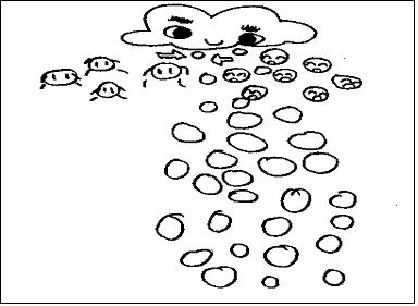 "컵에 물이 있으면 그 물이 하늘로 올라가는데 하늘에서 그 물들이 꽁꽁얼어서 눈이되요"