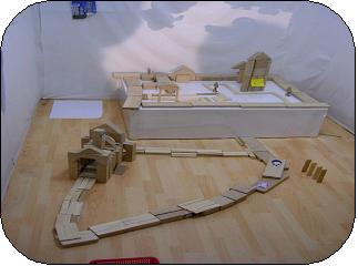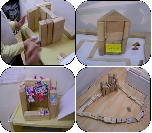 역할을 정하고 어떻게 구성할 것인지 설계도도 그렸다.완성된 설계도를 설명한 후 여러 가지 블록과 카프라를 사용하여 만드는 중...
