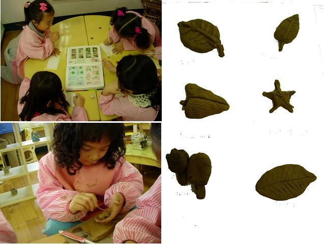 “우리 그릇 만들때처럼 찰흙으로 만들어서 색도 칠하고 그러면 어떨까?” 자기만의 예쁜 나뭇잎을 달아주기 위해 책의 도움을 받기도 했다. 어린이들은 어느새 어느 책에 가장 다양한 나뭇잎 모양이 있는지 알고 책을 척하고 펴든다. 어떤 나뭇잎 모양을 만들지 결정하고 만드는 친구들! 그 표현 또한 섬세하다. 나뭇잎의 다양한 모양과 그에 따른 테두리의 매끄러움과 꺼칠꺼칠함 표현, 그리고 잎맥의 다양한 무늬의 표현이 나타난다. 그것을 표현하기 위한 책략 또한 다양하다. 찰흙덩이에서 나뭇잎 모양을 자르기도하고, 나뭇잎 맥을 철사로 하나하나 그리기도하고, 다양한 굵기의 타래를 만들어 잎맥마다의 느낌을 표현하기도 한다.지난시간 이순신 동극 연습에서 나타난 문제는 바로 대사외우기와, 녹음한것을 켜놓고 말할때의 어려움, 자연스러운 흐름을 위한 대사의 연결과 무대의 변환, 동작고 어른같은 목소리의 표현등이었다.