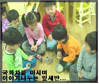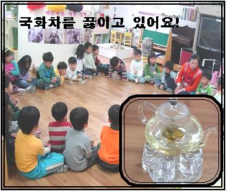 그동안 다도시간을 이용하여 차를 많이 마셔보아서 차 마시는 방법에 대해서 이미 알고 있는 잎새반 친구들.... 차를 마시며 향기도 맡으며 국화차맛에 대해서 이야기를 나누었다. 유아들 스스로 국화를 기르고 잘라서 만든 국화차라서 더 신기해 하고 더 맛있어 하는것 같았다.