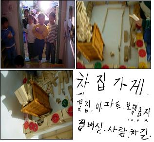 교사가 제시한 종이 위에 마을에 어떤 부분이 필요한 지 의논을 하고 기록하였다. 차, 집, 신호등...조형영역에서 우유팩 여러 개를 이어서 무언가를 열심히 만든다. 어떤 문제에 부딪힌 것 같은데...