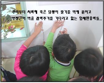 죽어버린 담쟁이의 줄기를 들고 교실로 들어와 벽에 붙여 보았으나 이미 죽어버린 담쟁이는 벽에 붙으려하지 않았고 또다시 담쟁이 살리기 고민에 빠져버린 잎새반 유아들...어떻하면 좋을까요?