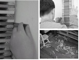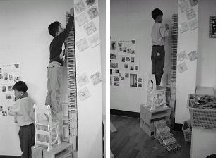 #교실 천장까지 쌓아올린 탑은 몇 분이 채 되기도 전에 무너지고 말았다. 아이들은 실망에 찬 눈빛을 보내며 한숨을 쉬기 시작하였다. 하지만 유아들의 도전은 계속되었으며 또 다시 탑은 세워지기 시작하였다. 그런데 유아들이 밟고 올라가 카프라를 쌓아올리던 의자와 그 밑을 받치고 있는 공간 블럭이 밀려 넘어지면서 탑은 무너지고 말았다.