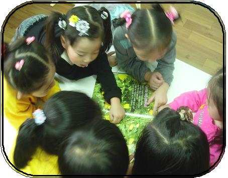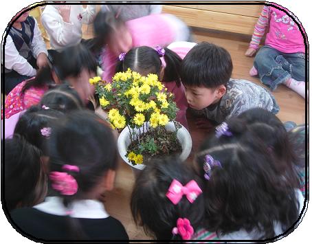 유치원 앞에 있던 노란색 국화화분을 교실로 들고 들어 왔다. 국화를 보기위해 유아들이 국화를 둘러 싸고 있었다.