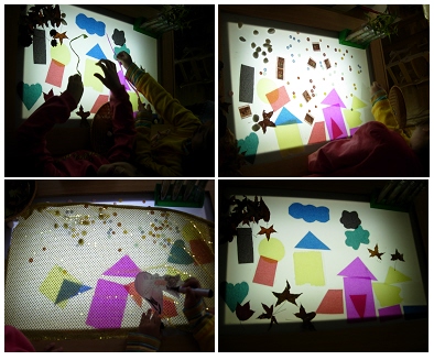 다음날 교사는 색한지를 코팅하여 라이트테이블 위에 슬쩍 올려놓았어요. 유아들은 빛과 한지의 만남에 매료되어 아름다운 그림을 구성하기 시작했어요. 어떤 그림 이야기일까요? 한번 상상해보세요.빛을 이용하는 영역은 또 어디가 있을까요?