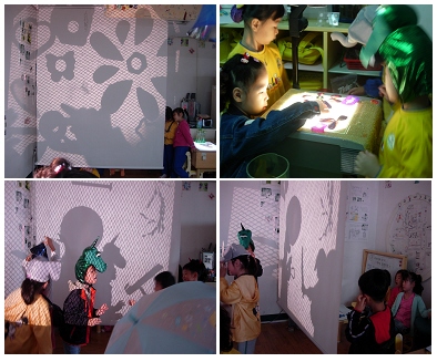 바로 OHP지요! 유아들은 OHP위에 구성하는 것과 유아들이 그림자 극을 함께 하기를 원했어요. 친구들에게 그림자 극을 보여주고 싶었던 거지요.