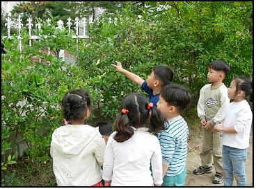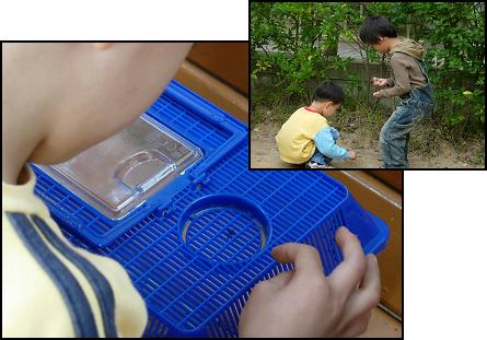 거미를 데리고 온지 이틀 후 한 친구가 “선생님.. 거미 배고프겠어요”하는 이야기에 거미 먹이를 찾으러 유치원 마당으로 나갔다.