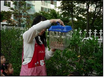 한 생명체에 대하여 두려움 보다는 존중하는 마음으로 바꾸어 주는 것과 거미에 대해 무엇인가를 알게 하는 목적으로 우리가 발견한 거미를 교실로 데리고 오기로 결정했다. 투명 통안에 나뭇가지를 몇 개 놔두고 생포하였다. 두려운 마음이 조금 있기는 하지만 일단 통안에 있다는 것에 안심하고 교실에서 관찰할 수 있다는 생각에 아이들은 너무나 좋아하였다.